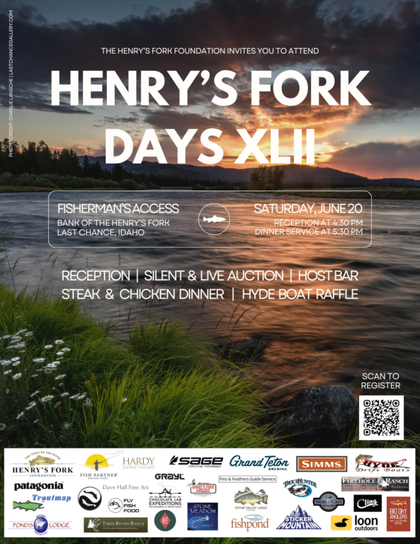 Includes a 7’ #3/4 line OR 7’9” #4/5 line Sweetgrass Bamboo Fly Rod with inscription “Henry’s Fork Guardian” AND Hardy Perfect Fly Reel, table for 10 guests, host bar, and recognition as an event sponsor. PLUS sponsor a specific reach of the river and stand shoulder to shoulder with the other heroes who share your commitment to protecting and strengthening the Henry’s Fork and a HFF Life Membership. As well as a Life Member hat and pin and never pay dues again!