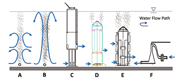 Examples of lake oxygenation infrastructure. (A) line diffuser with low enough gas flow to maintain stratification, (B) line diffuser with high enough gas flow to prevent stratification, (C) traditional full-lift hypolimnetic aeration, (D) submerged partial-lift hypolimnetic aeration, (E) depth-selective layer aeration, and (F) conical oxygen contactor, aka “Speece Cone.” from Moore et al. (2015).