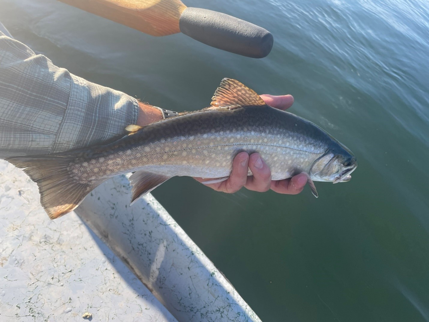 A wild brook trout caught in August 2024 in Island Park Reservoir. The fish was spotted chasing baitfish along the weed edges and eagerly took a streamer stripped near the surface. <photo by the author>