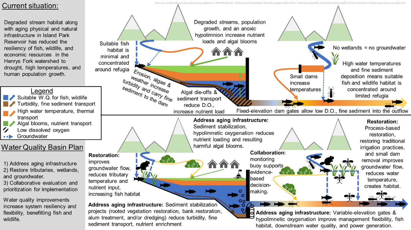 Conceptual diagram of DIRTT plan strategies to improve temperature and turbidity in the Henry’s Fork watershed.