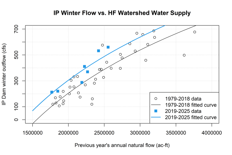 Based on the statistical relationship between water supply and winter outflow, we expected the 2025 winter outflow to be 280 cfs. With an average winter outflow of 288 cfs, we beat that expectation. In fact, this was the 7th consecutive winter that outflow from the reservoir beat expectations based on water supply. This coincides with HFF’s efforts to improve precision water management infrastructure, data provisioning, predictive models, and strategies to save water in the reservoir that were first implemented in 2018.