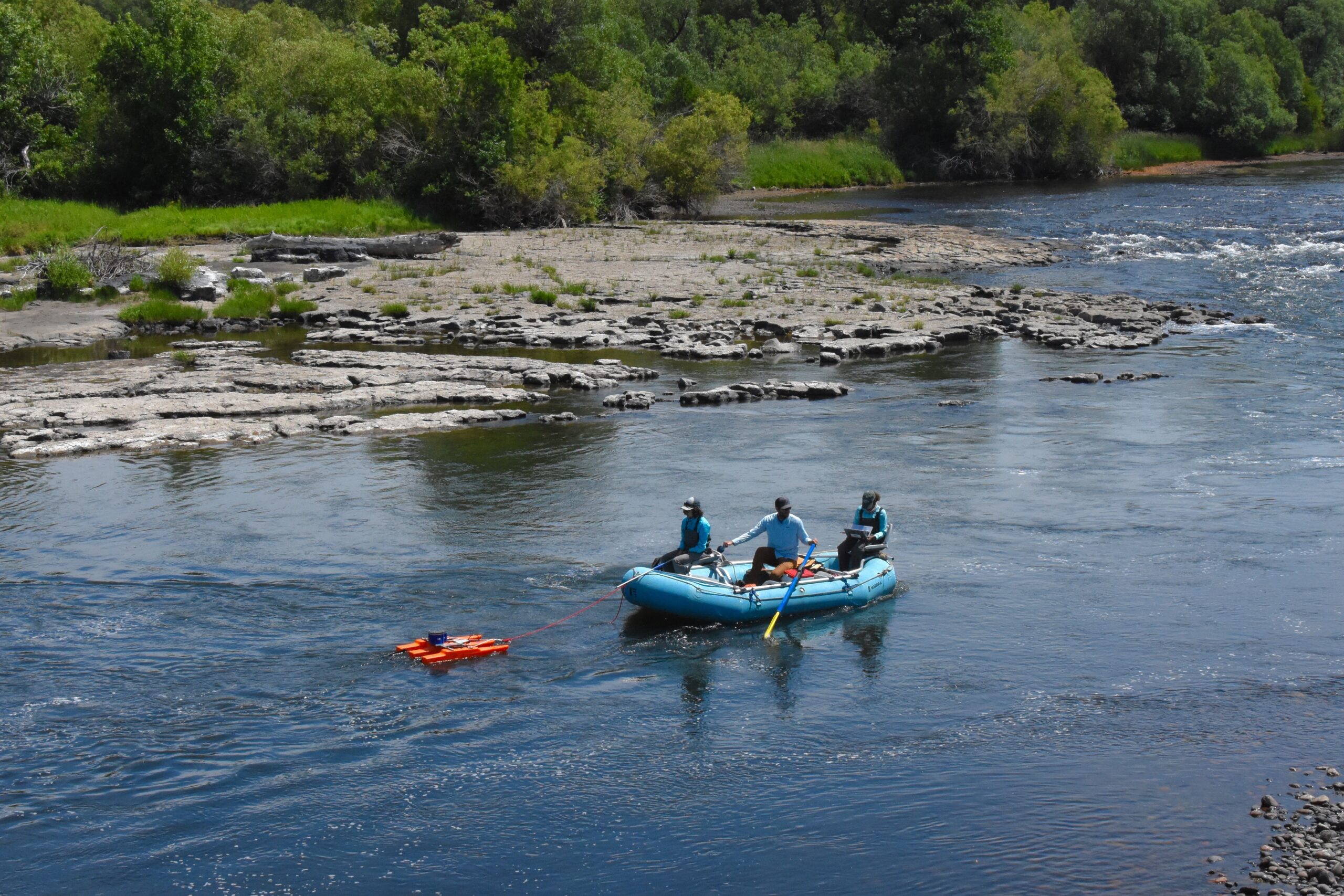 There are many techniques for deploying the ADCP. The U.S. Geological Survey uses cableways and sometimes bridges. At the Henry’s Fork Foundation, we deploy the ADCP by pulley, boat, and walking.