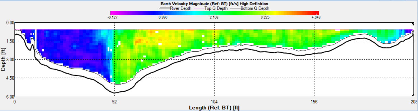 To measure discharge, we move the ADCP in (at least) four transects across the river. For example, we’ll start on the left bank and move towards the right bank, then right bank to left bank, and then repeat. The ADCP computes the average of the four transects to output a discharge measurement and its associated error. As the ADCP moves from bank to bank, it uses Bluetooth connection to store, visualize, and communicate its data in real-time on a laptop. See the output below. The channel bottom is shown in the dark black line; the squares show velocity at different depths as we move across the river channel.