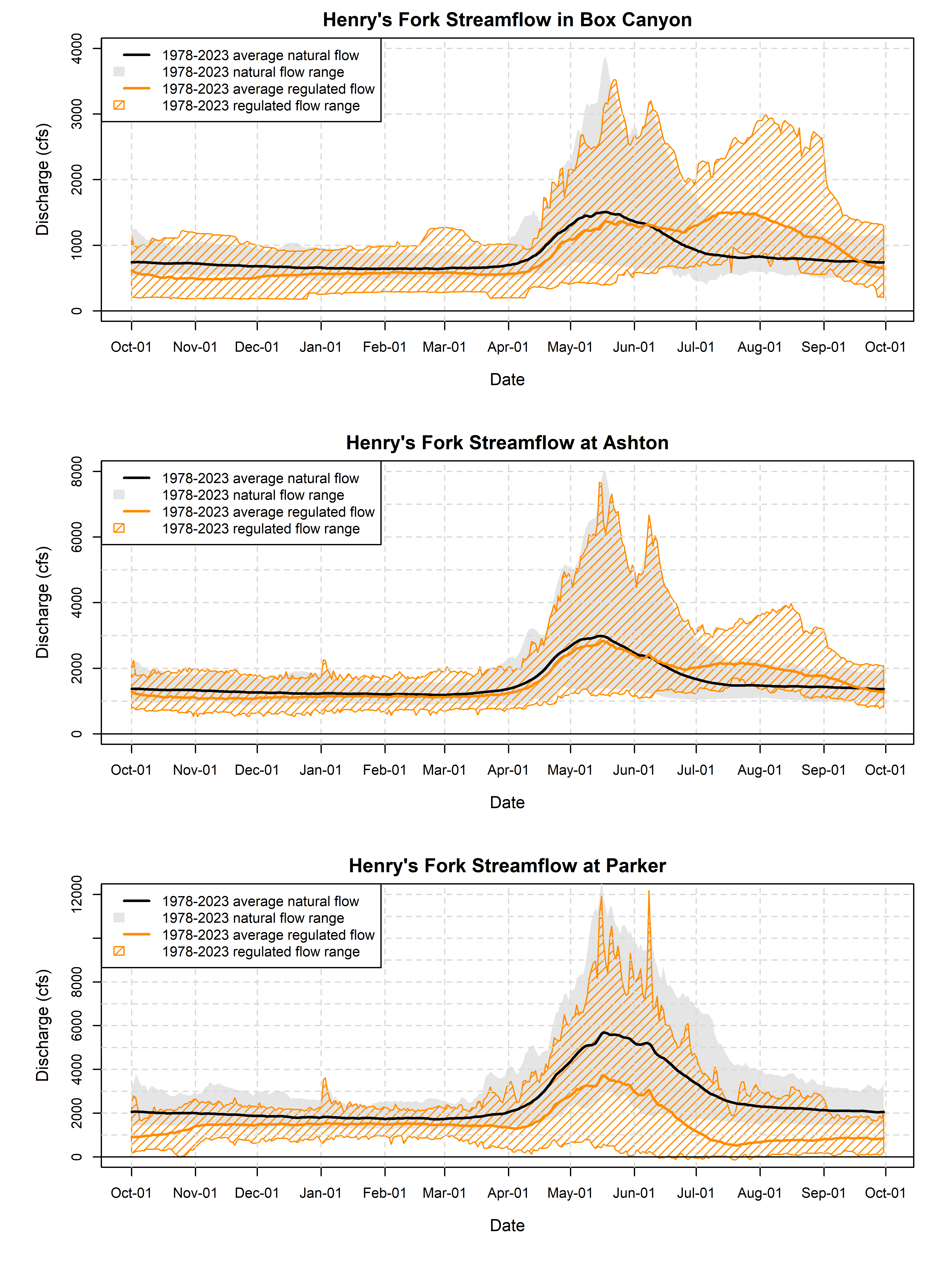 The evidence is pretty simple to present. I’m attaching two graphics today. The first compares the river’s natural flow (what would be present in absence of management and use) with regulated flow (what actually is in the river) at three locations on the Henry’s Fork: Box Canyon, Ashton Dam (Ora Bridge), and Parker (Red Road Bridge). The black curves and gray shading show average natural flow and the range of natural flow, respectively. The orange curves and orange cross-hatched polygons show average regulated flow and its range, respectively.