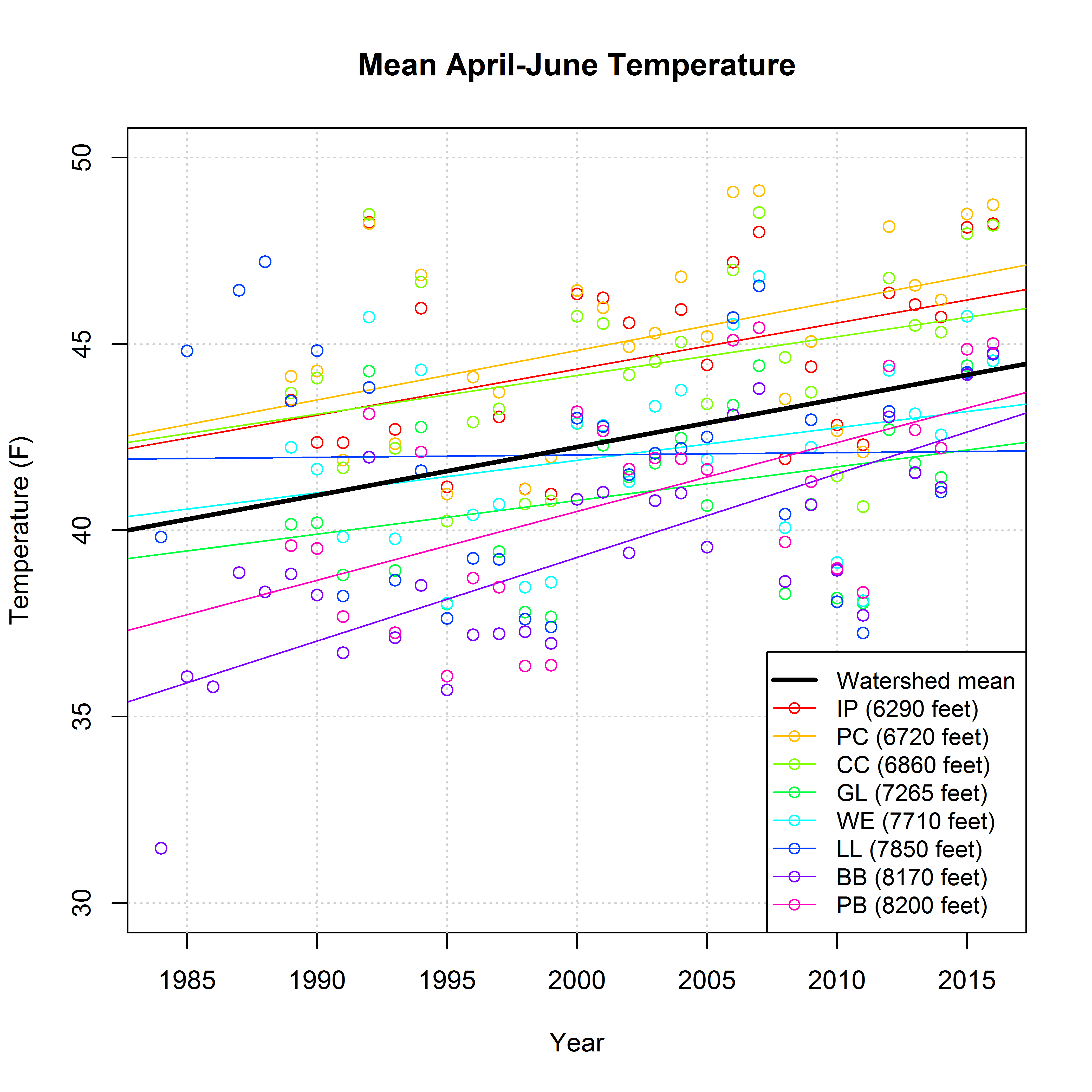 - Over the past 30 years, mean April-June temperature at the watershed’s snow survey sites has warmed at 1.29°F per decade. All other factors being equal, this moves the 30-day peak flow window 5.4 days earlier each decade. Global climate models and data predict continued warming over the next few decades, so we can expect continued earlier runoff.