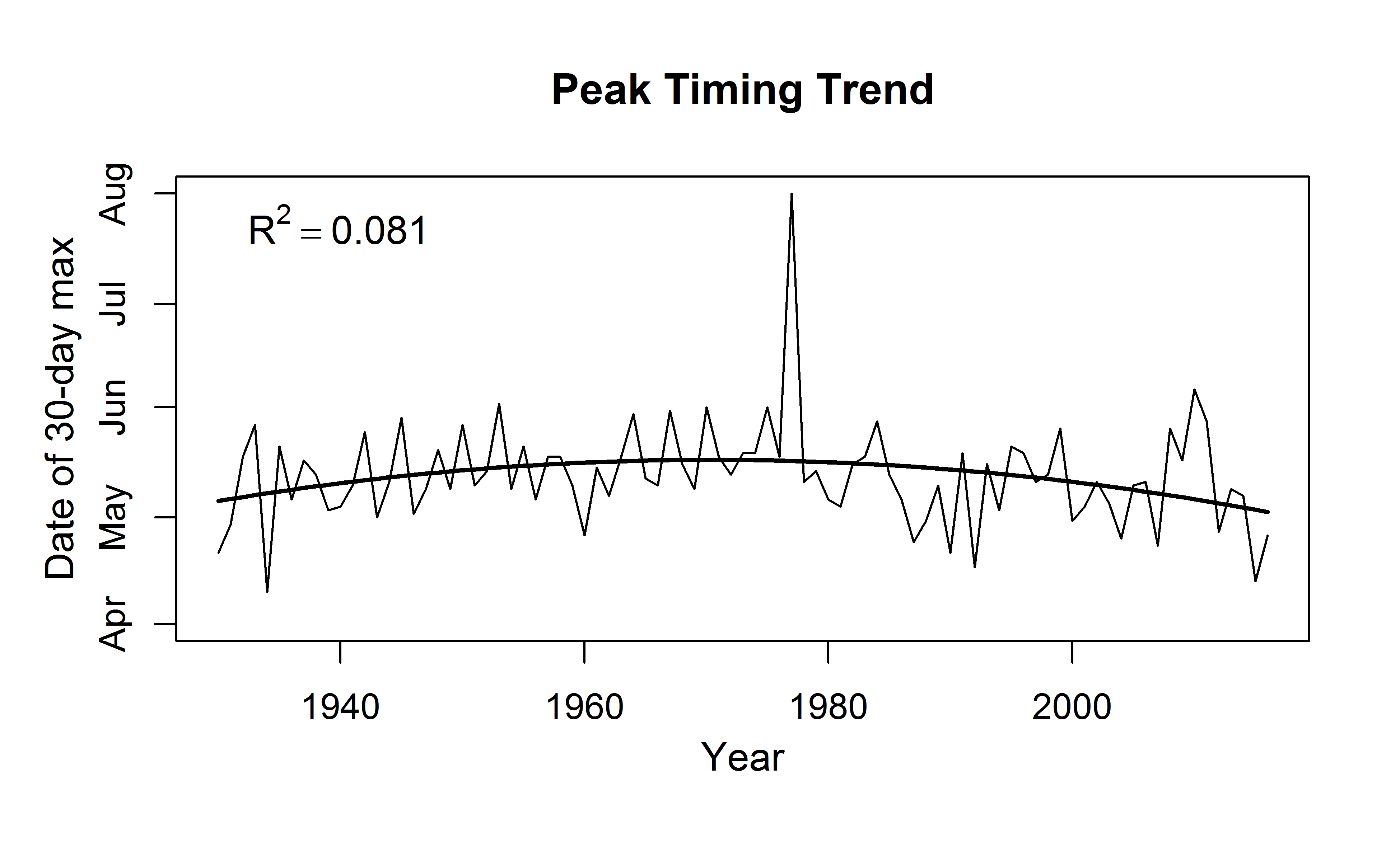 - Date of peak flow. The peak flow is usually defined as the peak over a number of days, for example the peak 7-day flow. We use the peak 30-day flow to smooth out narrow peaks caused by short-term weather events. The larger time window produces much better statistical results and is thus more predictable than shorter-period peaks. We report the date in the center of the 30-day window over which streamflow is greatest.