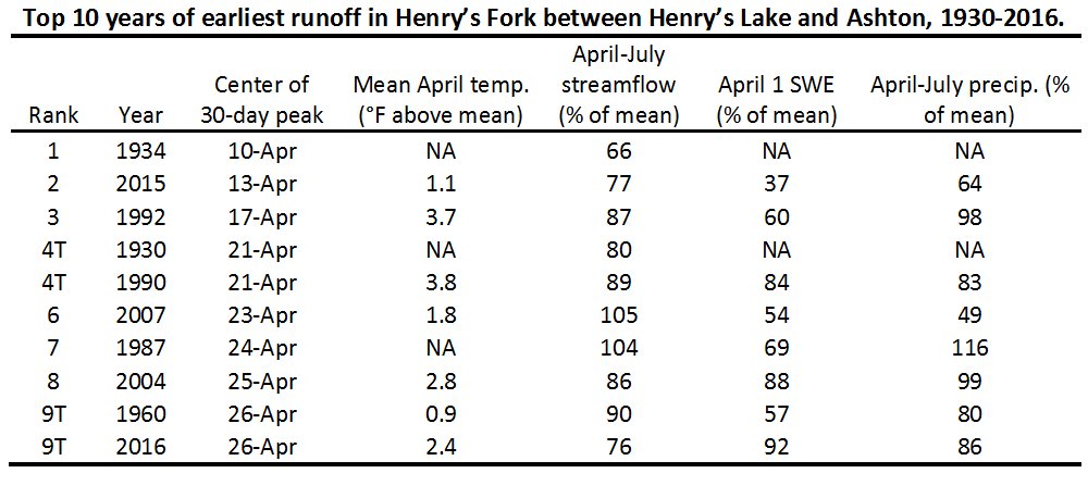 Runoff timing in 2015 and 2016 was among the earliest on record. The table below gives statistics for the top-10 earliest runoff years in the upper Henry’s Fork watershed. This is an 87-year record, and 2015 and 2016 are both in the top 10. Note that two of the years in the 1930s are also in the top 10. The same patterns shown in the scatterplots above are apparent here; years with early runoff were warmer than average, with below-average snowpack. These years generally had below-average April-July streamflow and below-average April-July precipitation. In this table, “NA” indicates that data are missing for that particular year. You can download a spreadsheet here that contains the entire 87-year record of these statistics.