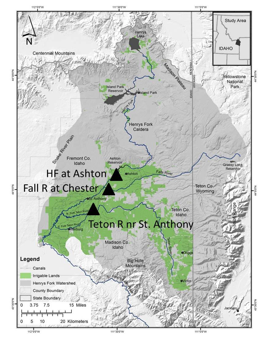 In the Henry’s Fork watershed, we consider the runoff period to last from April 1 to July 31. That rather wide period is necessary because the three major tributaries in the watershed—upper Henry’s (upstream of Ashton), Fall River, and Teton River—vary greatly in watershed elevation and runoff timing. The map below shows the three gage locations where we measure each of these three tributaries. We need the long window to capture the respective peaks of all three tributaries.