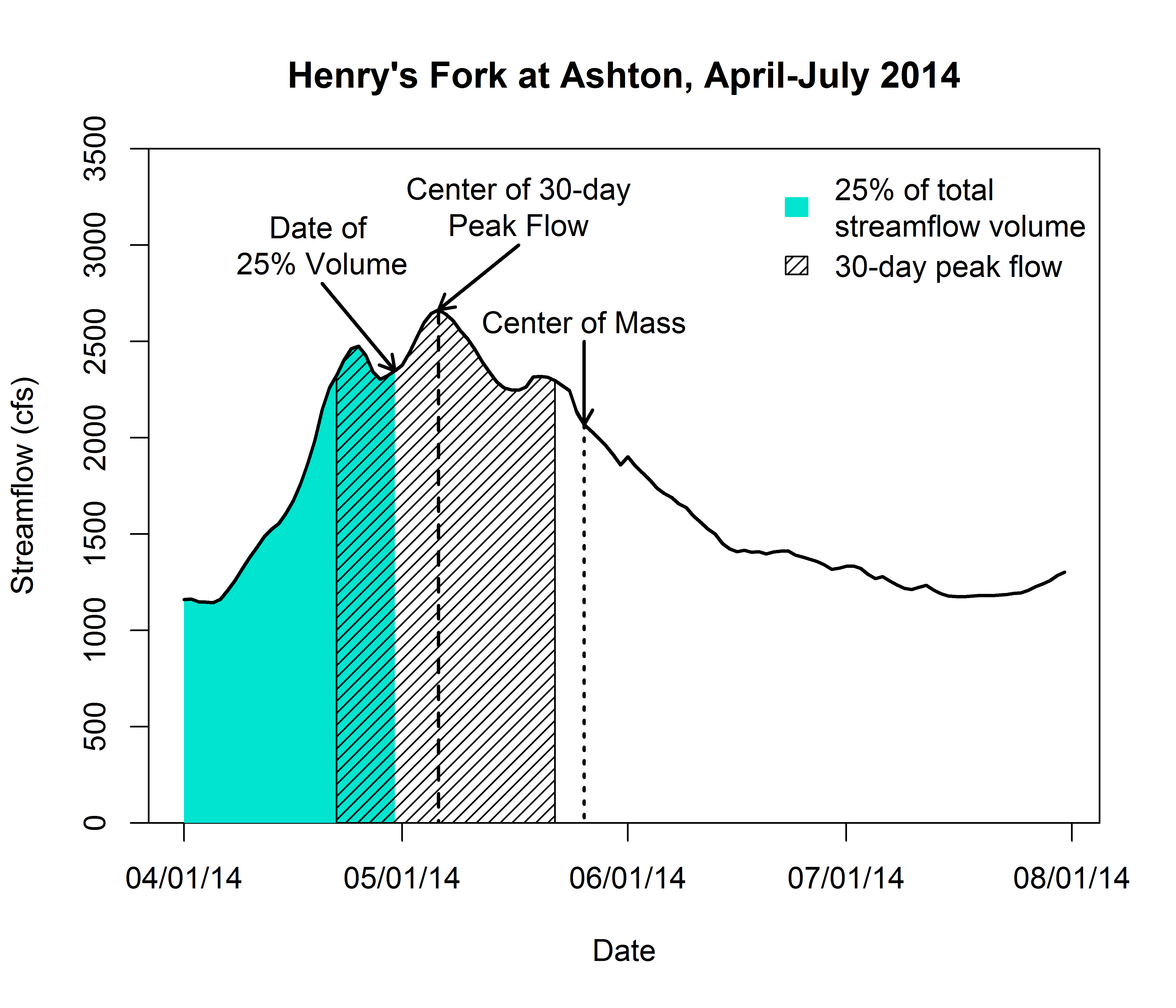 These three measures are indicated on the following hydrograph, which shows natural streamflow in the Henry’s Fork at Ashton during 2014. In this example, the center of 30-day peak flow happened to coincide with the one-day peak, but that actually doesn’t happen very often. This graphic also illustrates another way to think of the center of mass. If the area underneath the streamflow curve was a thin ceramic plate, the center of mass would be the balance point of the plate. Because streamflow is higher in April and early May than over the rest of the time period shown here, the center of mass is to the left of the midpoint of this time period, which is June 1. If streamflow were exactly the same every day between April 1 and July 31, then the center of mass would be June 1.