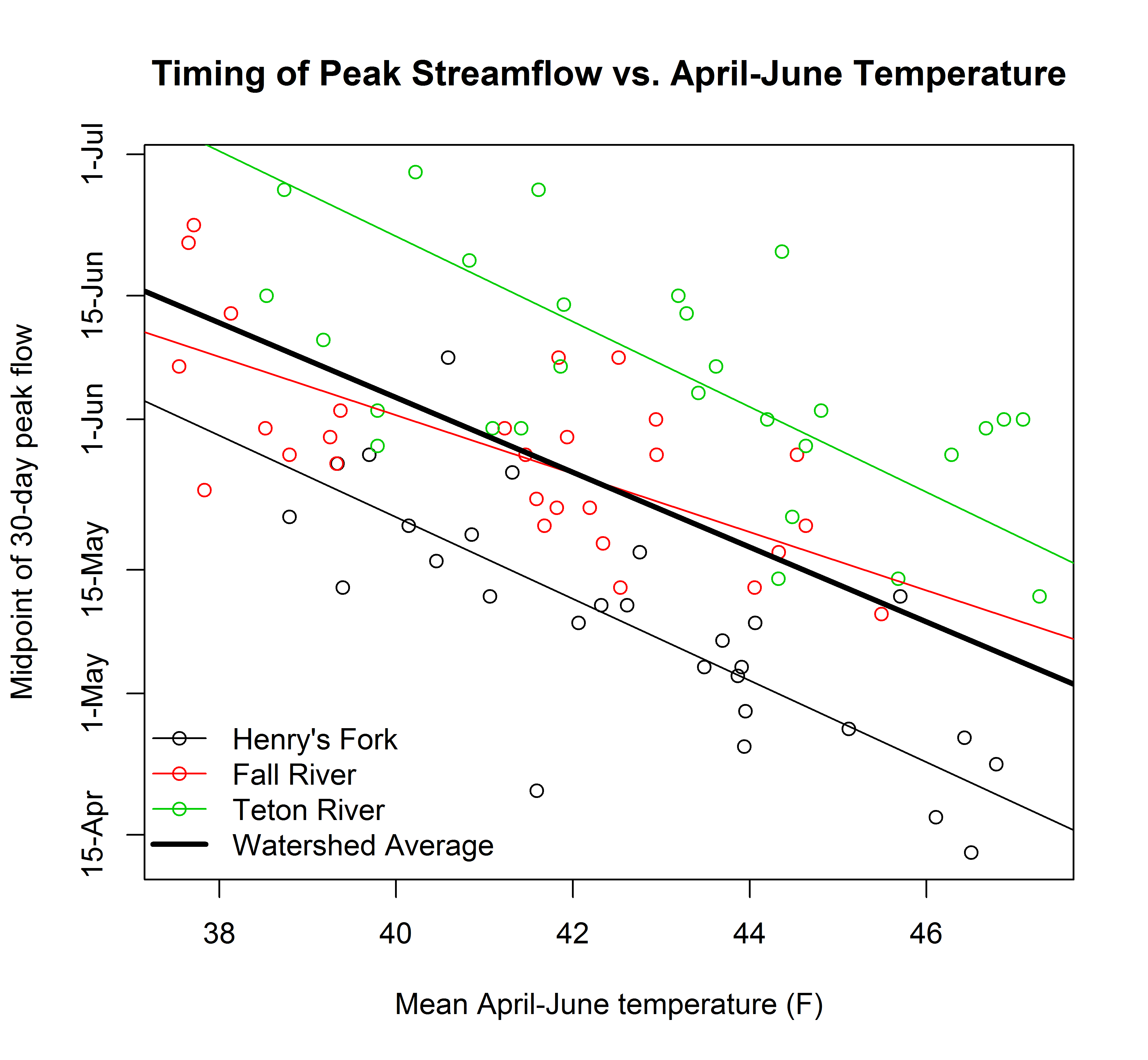 The dependence of 30-day peak flow timing on April-June temperature is shown in the following graph. Regression lines for each of the three subwatersheds are shown by the thin lines; the watershed average is given by the thick black line. It’s easy to see from this graph that the upper Henry’s Fork peaks 7-14 days earlier than Fall River, which peaks 7-14 days earlier than the Teton River.