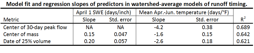 - Runoff timing is most strongly influenced by April-June temperatures (warmer = earlier runoff) and April 1 snow-water-equivalent (SWE; more snow = later runoff).