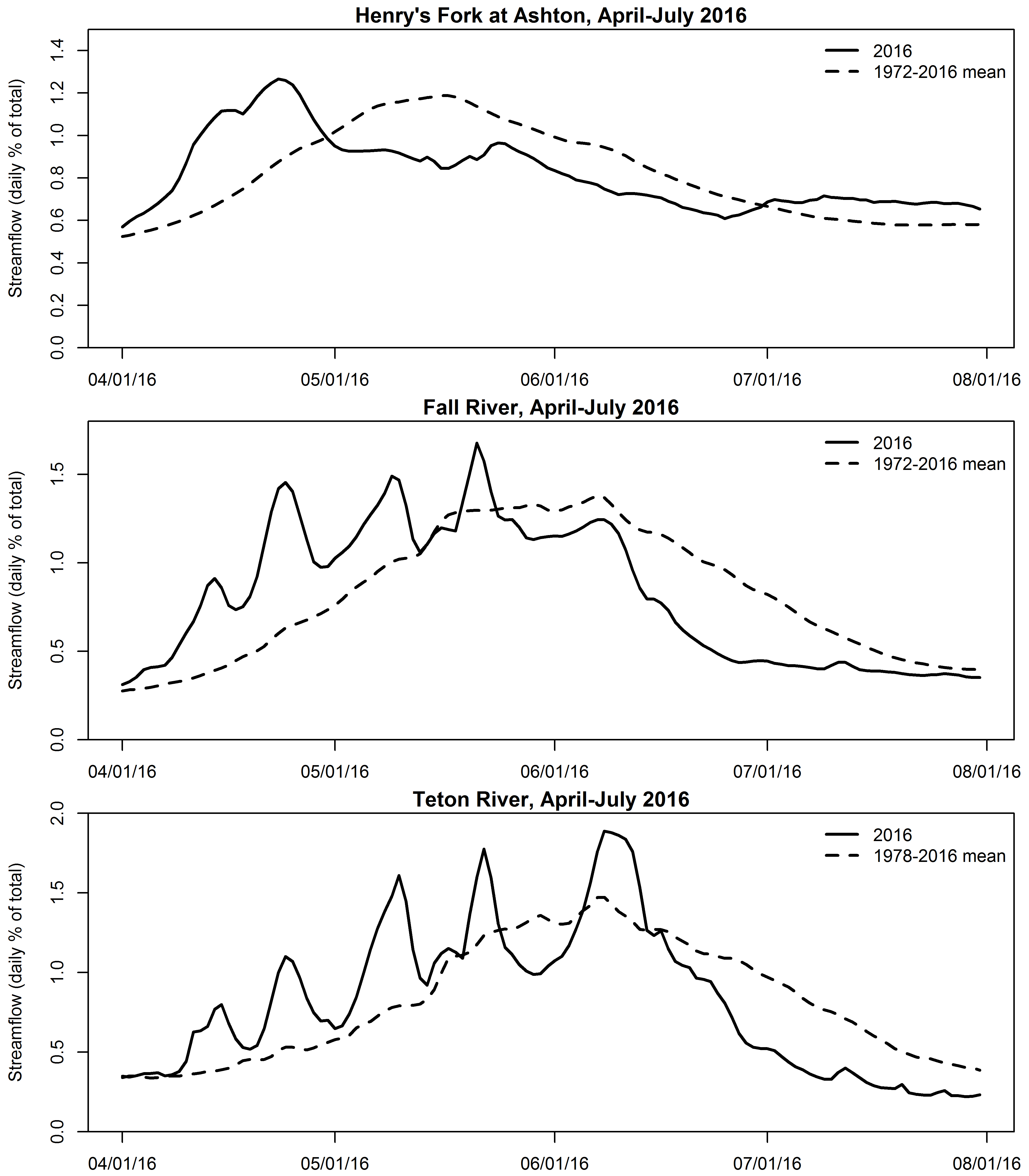 It is not a coincidence that the more than 600 anglers we interviewed in Harriman State Park in 2014 overwhelmingly rated the fishing experience that summer above average. In 2016, anglers overwhelmingly rated the fishing experience in Harriman State Park well below average, with high flows out of Island Park Dam cited as the number one reason for poor fishing. Early runoff in each of the Henry’s Fork subwatersheds in 2016 is shown in the graph below. These graphs show temporal distribution of flow only—not actual volume of flow. The graphs show daily percent of April-July flow, and it is obvious that a much greater fraction of the flow relative to average occurred during April and May, leaving a much lower fraction of flow in the river during June and July. This necessitated early and high delivery of water from Island Park Reservoir to meet irrigation demand, resulting in higher-than-average outflow from through Harriman State Park from June 20 to August 3.
