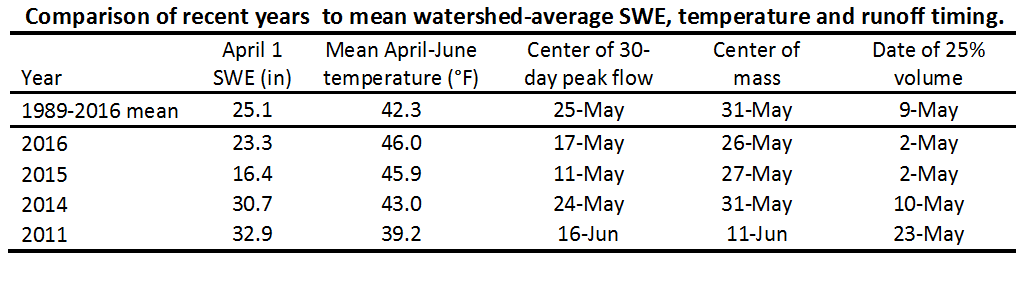 The following table focuses in on notable years in the recent past. Watershed-averaged runoff in 2015 and 2016 was earlier than average by all measures Compare those two years with 2014, when runoff timing, temperature, and SWE were all very close to average. The last big water year we had was 2011, which had late runoff as a result of high snowpack and cool temperatures.