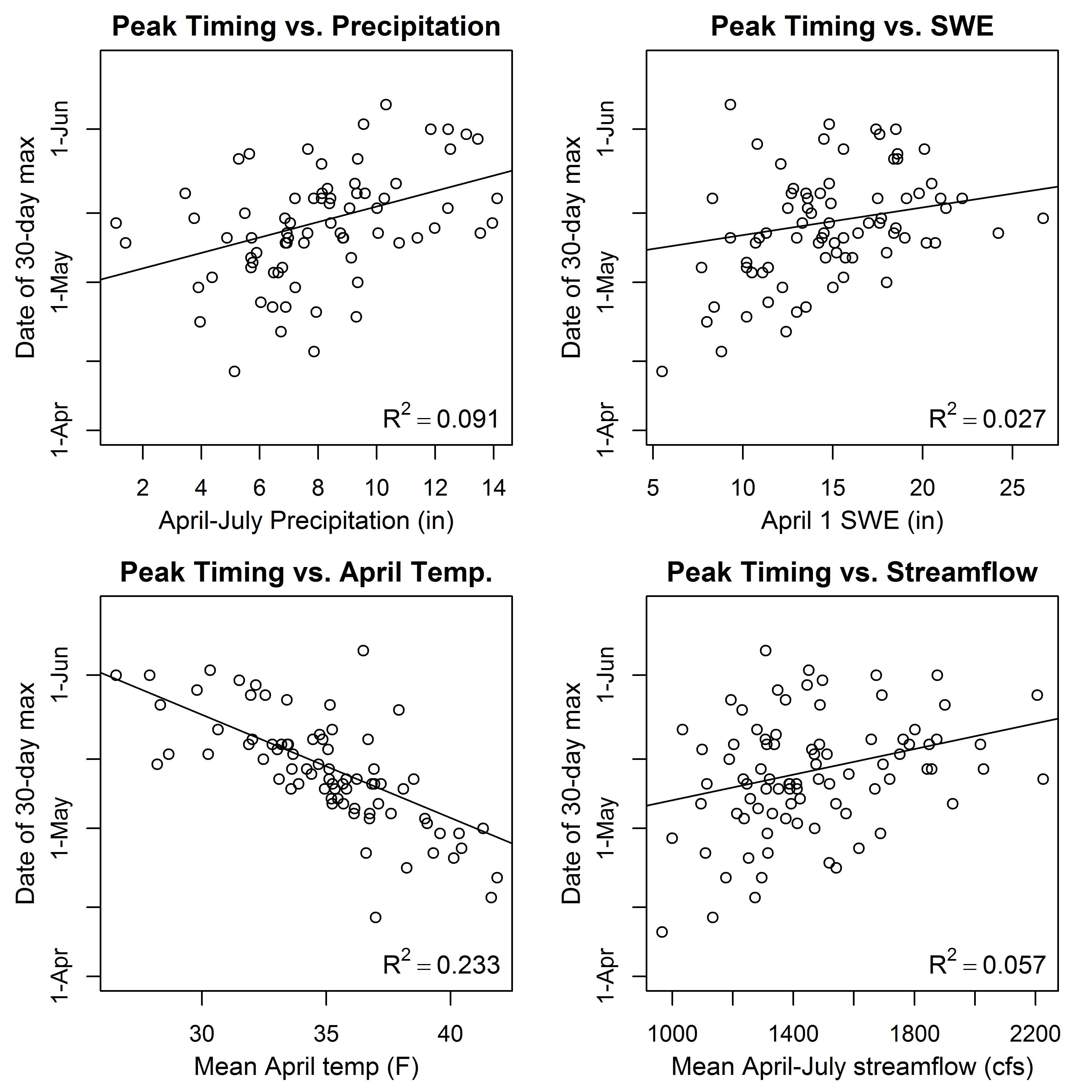 These relationships were all intuitive: runoff timing is later when spring/summer precipitation is higher, April 1 SWE is greater, April temperature is cooler, and streamflow is higher. However, the relationships were weak; only the precipitation and temperature relationships were statistically significant.