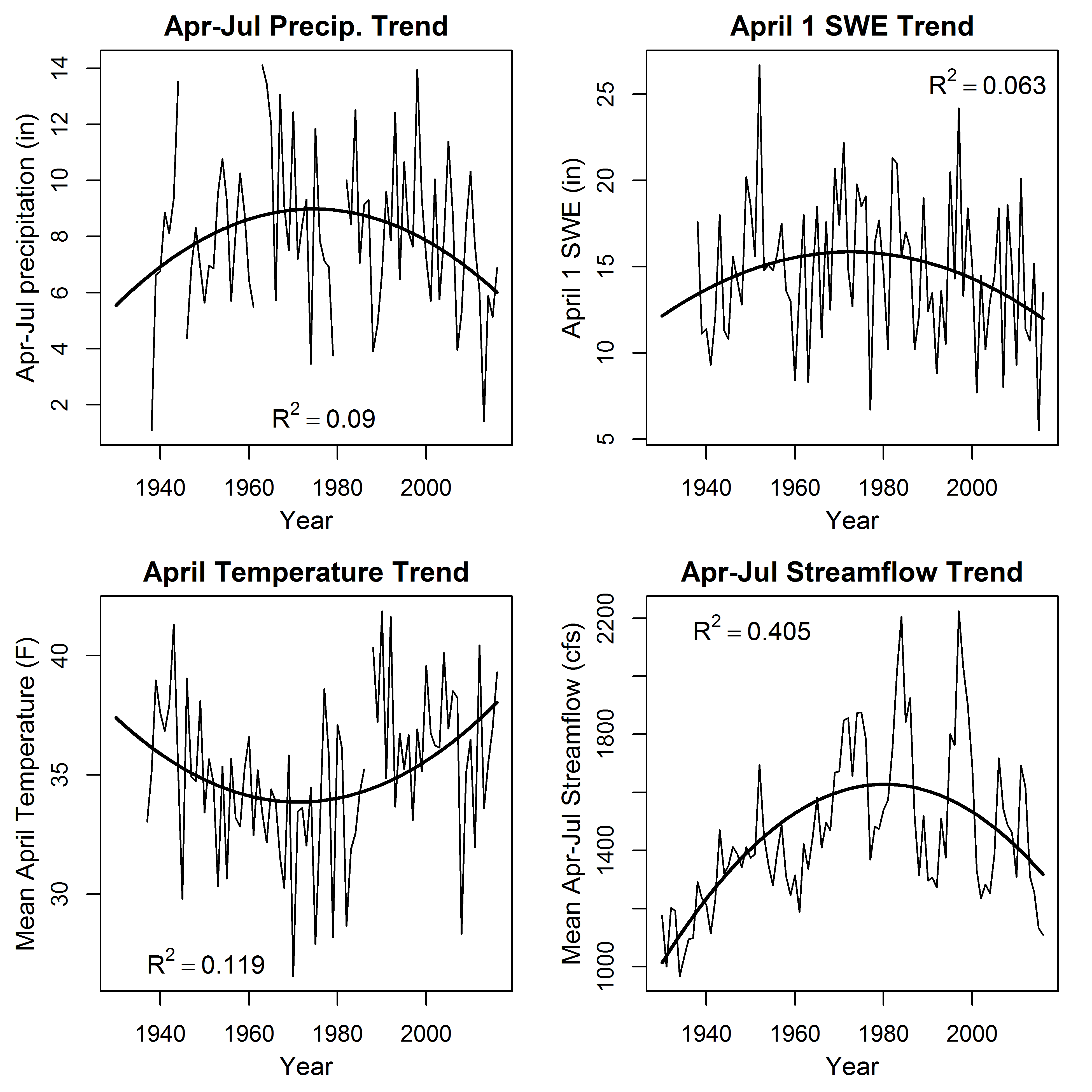 The graphic below shows long-term patterns in the climate variables. All of them show the same parabolic pattern. The 1970s were, on average, wetter and cooler than earlier and subsequent decades. April temperature and April-July streamflow show the strongest of these parabolic patterns. The trend in the April temperature graph over the last 30 years is similar to that shown in the figure above. Note that the decreasing trend in April-July streamflow over the past 40 years has been driven primarily by several sequences of very low water years in the late 1970s, late 1980s/early 1990s, early 2000s, and 2014-2016. That graph also shows that streamflow has been much more variable over the past 40 years than it was in the 1930s through the 1960s.