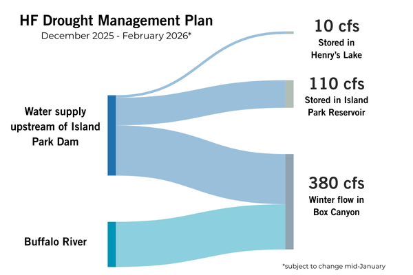 To meet the 380 cfs winter target, outflow will need to be flexible later in the season. Depending on how the 2026 water supply shapes up, outflow from Island Park Dam may need to be decreased on March 1. This reduction would allow Island Park Reservoir to fill more rapidly in March and April ahead of summer irrigation demand.